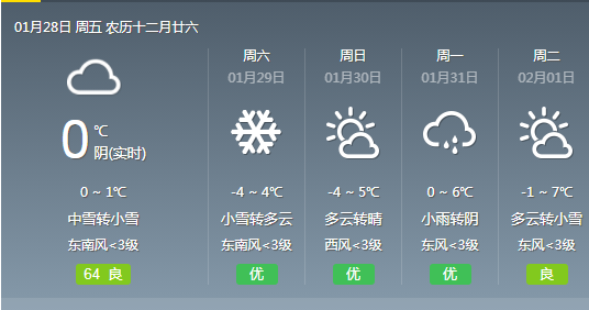 昨天夜间我县降雪加强,27日08时至28日08时累计降水量5毫米,全县最低气温-6.4℃(野人谷镇东蒿村28日03时),目前我县中部平坝地区积雪3-5厘米,二高山以上地区雪深8-10厘米。预计今天白天中到大雪;今天夜间小雪转阴天;29日阴天转多云;30日多云。
