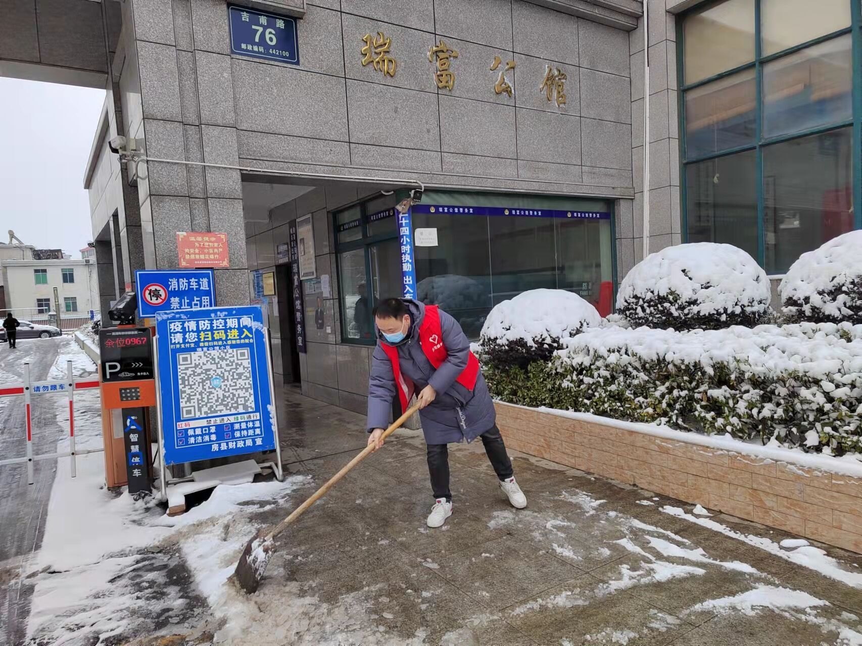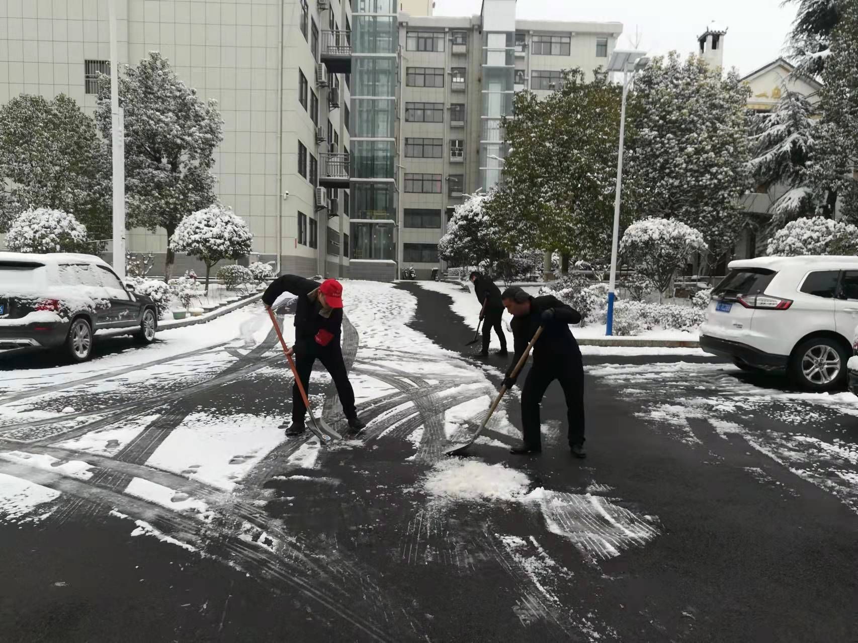 房县新闻网讯 通讯员 张骏熙 程悦 报道:昨晚突降大雪,城区大部分路段出现积雪,给人民群众出行带来了极大不便,为排除雪天道路所带来的安全隐患,房县财政局积极开展“扫雪除冰情暖房陵”志愿服务活动,组织机关党员干部在下沉包联小区开展扫雪除冰工作。