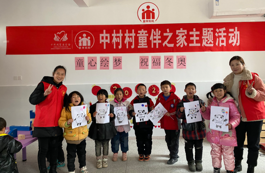 “童伴妈妈”和孩子们用彩色卡纸剪切、拼接,组成灯笼、鞭炮等具有浓烈新春氛围的元素,亲手写上新年愿望,打造了一面独特的“心愿墙”。接着,孩子们团团围坐,和“童伴妈妈”一起完成冰墩墩绘画。“我也有自己的冰墩墩啦!”孩子们手舞足蹈,和小伙伴分享着绘画的快乐。最后,大家一起表演舞蹈《雪花》,用自己的方式为北京冬奥会加油助威。志愿者秦佳苗介绍:“节气过完,很多父母已经外出务工,孩子与父母短暂相聚后又要分别,‘童伴妈妈’用这种方式陪伴孩子,希望弥补他们分别的不舍和难过,多一些快乐。”