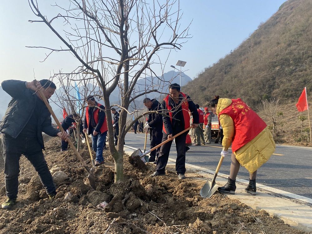 房县新闻网讯 通讯员 谢鸽 报道:人勤春来早,植树正当时。2月28日上午,天朗气清,惠风和畅,春意盎然。在军店镇中村村沿河黑色化道路两侧,200余名“红马甲”挥锹铲土,种植树木,为堤岸披上绿色新衣,引得游人驻足观看,热闹非凡。