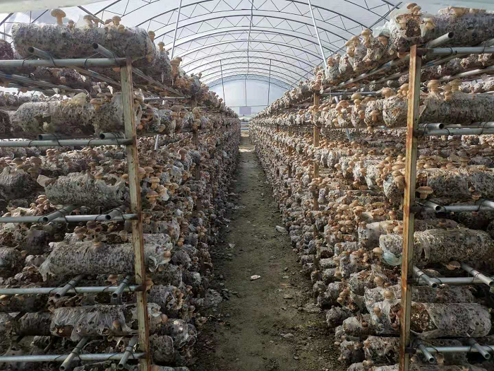 图为大棚内摆放整齐、浑身长满菇的菌袋