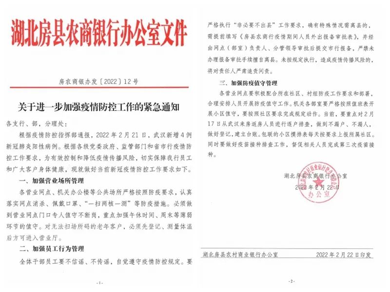 闻令而动,全面部署到位。鉴于当前疫情防控形势日益严峻,房县农商行结合各级党委政府和省市行防疫工作部署,第一时间下发了《关于进一步加强疫情防控工作的紧急通知》,从加强营业场所管理、人员管控、下沉值守等方面提出明确要求,并强化防疫物资配给,慎终如始、科学精准地做好疫情防控工作,确保员工和客户身心健康,保障业务经营安全运行。