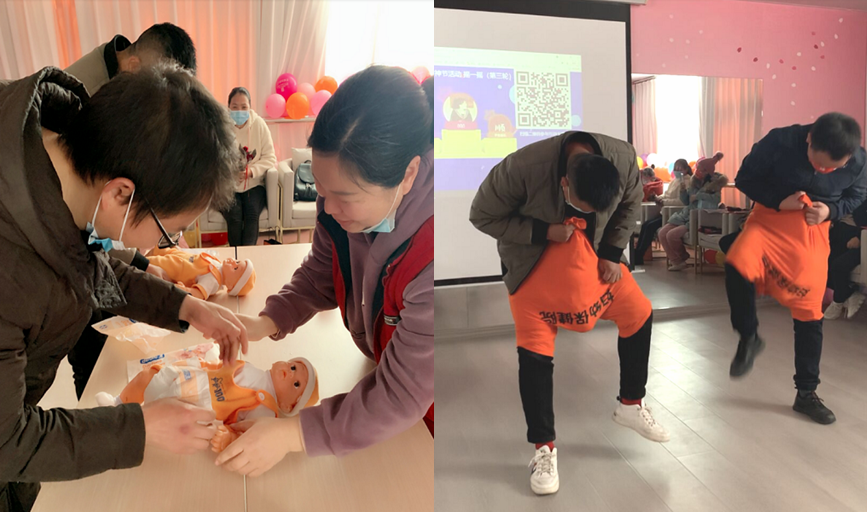 活动在手机“摇一摇”小游戏中拉开帷幕,随后孕产保健科护士长刘妮娜向大家普及了产后康复相关知识,呼吁广大宝妈们关注产后健康。现场“假如我是孕妇”游戏环节,让准爸爸们体验了一把孕妈的艰辛,准爸爸们“身怀六甲”,按照主持人的提示进行自由体位“生产”,看着他们滑稽的模样,逗得准妈妈们开怀大笑。在给宝宝换纸尿裤环节,看似简单的事情,准爸准妈们都无从下手、手忙脚乱,最后医护人员给予了现场教学示范。