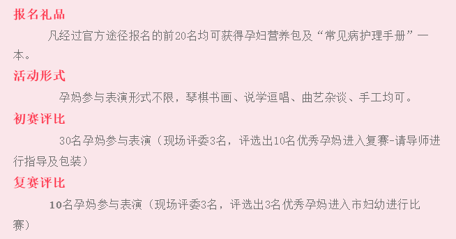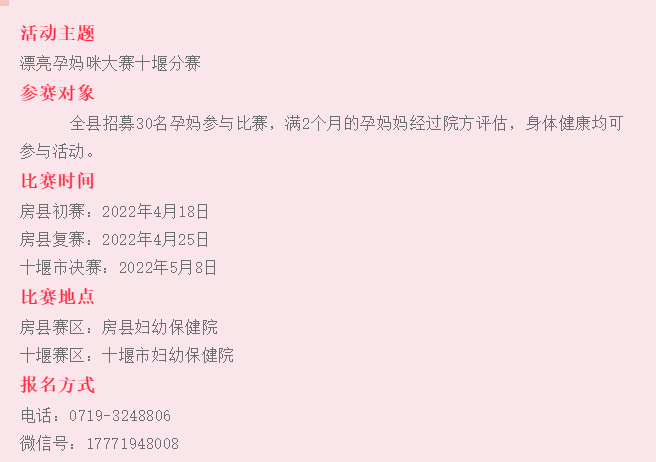 为加强孕期优生优育指导,倡导科学孕育观,打造妇幼健康文化品牌,由中国妇幼保健协会指导,湖北省妇幼保健协会、湖北省优生优育协会、湖北省省市州各妇幼保健院主办的“湖北省第十一届漂亮孕妈咪大赛十堰分赛”活动即将启动……