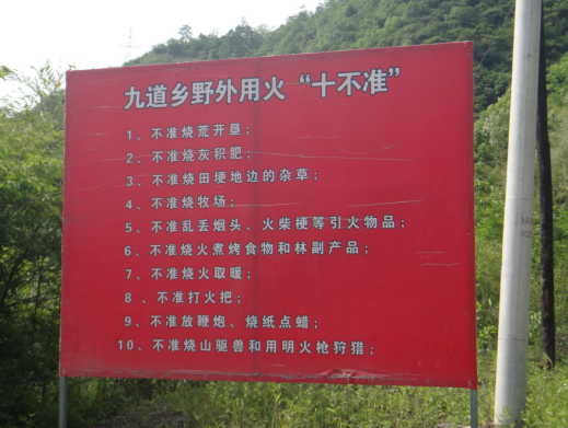 据了解,九道乡毗邻神龙架林区,森林面积44.03万亩,森林覆盖率大。随着春耕活动的开展和清明节的即将到来,火灾隐患不断加大,森林防火随之进入高峰期。为加强春季森林防火安全,增强公民森林防火意识,全乡上下按照“零火情”、“零事故”目标,采取了多种强有力的措施保障森林防火安全。以树立宣传牌、发放宣传册、张贴宣传标语等形式,向广大居民宣传森林防火安全知识,引导群众树立防火意识。