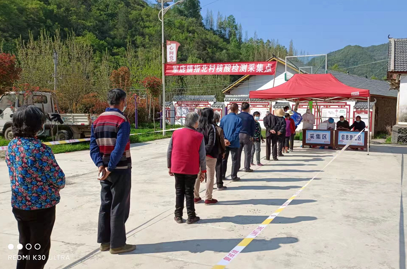 4月11早上6点,在军店镇双柏、指北等检测点,医护人员和志愿者分工明确,各司其职,密切配合,严格按照1米线、戴口罩、不扎堆等疫情防控要求,引导村民有序完成核酸采样工作,完成采样后的村民,快速有序地离开现场。