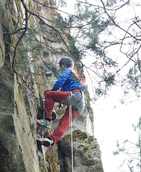 稍作准备,高度、江山绕到孤峰岩壁较为平整的一面,使用“打点上攀”技术,在岩壁上设置锚点,再利用绳索、安全带一点点上升,约3个小时后接近峰顶。夕阳下,远眺群峰耸立的柳树垭隧道一侧,奇峰岩林中片片灰白色岩壁点缀在大面积墨绿树丛中,还有柱状石峰、孤立岩墙、笋状石芽等“微观”山石,形成了造型多样、变幻无穷的组合。