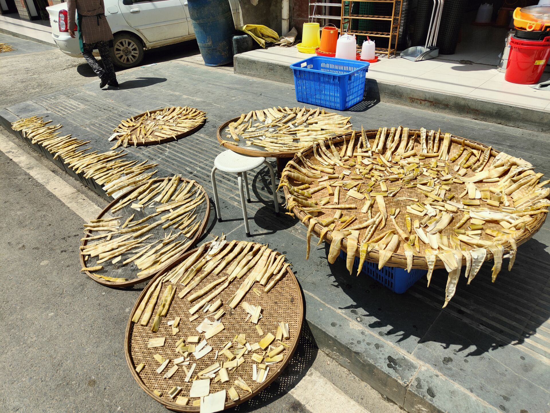 据刘某介绍,一锅笋有两三百斤,要煮两个多小时,经常翻煮,能够让笋煮得更透。等锅里的笋煮熟后,要马上出锅,把笋撕成条丝状。最后,把煮好的笋丝挂在晾晒架上,经过多天的晾晒逐渐去除水分,直到笋干颜色转为金黄才算完成制作。“一锅笋干加工好需要好几天呢。”