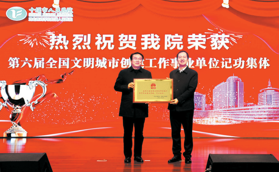 创建政治生活、生殖科普、航空医学等3大文化馆,连续举办5届“中国医师节”表彰大会,评选百名杰出人民医师,“仁德为怀、精诚为民”的核心文化理念深入人心。 2008年4月,医院确定了“飞翔鸽”医院 LOGO和“仁德为怀、精诚为民”的核心文化理念,形成以“仁”为核心的文化体系,培育了“医廉而正、护洁而尊”的廉政文化、“工作热情似火、岗位创先争优”的党建文化。医院先后荣获“全国医院文化建设先进单位”“全国医院人文管理荣誉奖”。2016年以来,医院蝉联全国文明单位称号。2021年,医院获评十堰市创建第六届全国文明城市事业单位记功集体。