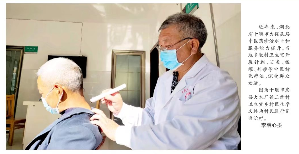 房县新闻网讯 通讯员 李明心 报道:近日,房县大木厂镇三岔村卫生室乡村医生李文林为群众开展艾灸治疗,被《中国中医药报》(2022年5月16日第一版)刊登报道。全文如下:近年来,湖北省十堰市针对基层中医药服务能力短板,力促基层中医药诊治水平和服务能力提升,当地多数村卫生室开设了中医特色疗法。据了解,如针刺、艾灸、拔罐、刮痧等简便验廉的中医特色疗法深受基层群众欢迎。