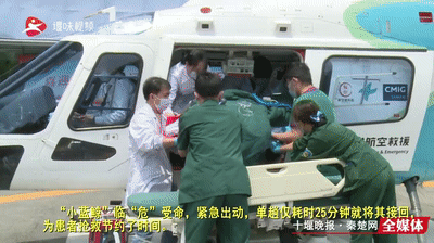 今天上午11点,十堰人医直升机从健康广场起飞。11点25分,直升机在竹山县指定位置降落,跟机医护人员紧急评估病情及对症处理后,迅速将患者转运至直升机上。11点37分,直升机再次起飞。12点2分,顺利抵达十堰人医健康广场。