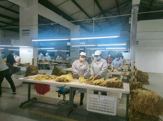 收购站内,分级工们忙着对烟叶分级。数十位工人两人一组,一人负责去青去杂,手法娴熟地将成捆烟叶打散,筛选出不能用的部分烟叶。一人负责等级分类,将烟叶按照部位、颜色、长短进行分级。