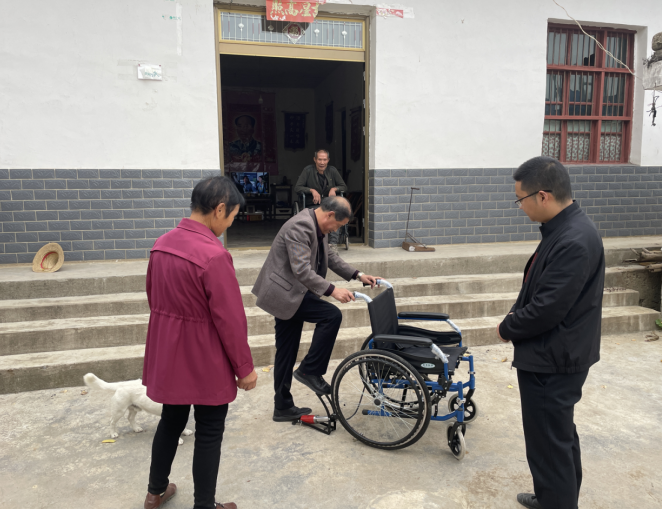 据悉,今年9月初,红旗村驻村领导干部和村“两委”干部开展入户大走访、排查矛盾隐患,常态化开展下基层、察民情、解民忧、暖民心活动时,得知杨承富目前坐的轮椅因使用时间长导致轮毂破损存在安全隐患后,现场收集相关资料,迅速协助申领新轮椅。近日,红旗村驻村领导、回龙乡分管民政残联领导会同驻村工作队将新轮椅送到杨承富的家中,现场给轮椅打气并安装检查。