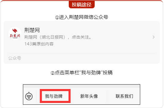 ⑴征文作品投稿可通过荆楚网微信菜单栏“我与劲牌”在线上传word文档作品,图片可插入Word内上传,文件不超过4MB。若文件过大,可通过邮箱投稿:wyjpdgs@163.com。投稿作品务必备注作品标题、作者真实姓名、联系方式及所在城市信息。