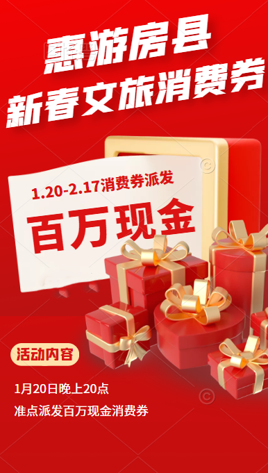 抢“惠游房县”新春文旅消费券,春节畅游千里房县!2023年1月20日(腊月二十九)晚上20:00,定好闹钟,准备好抢券吧!