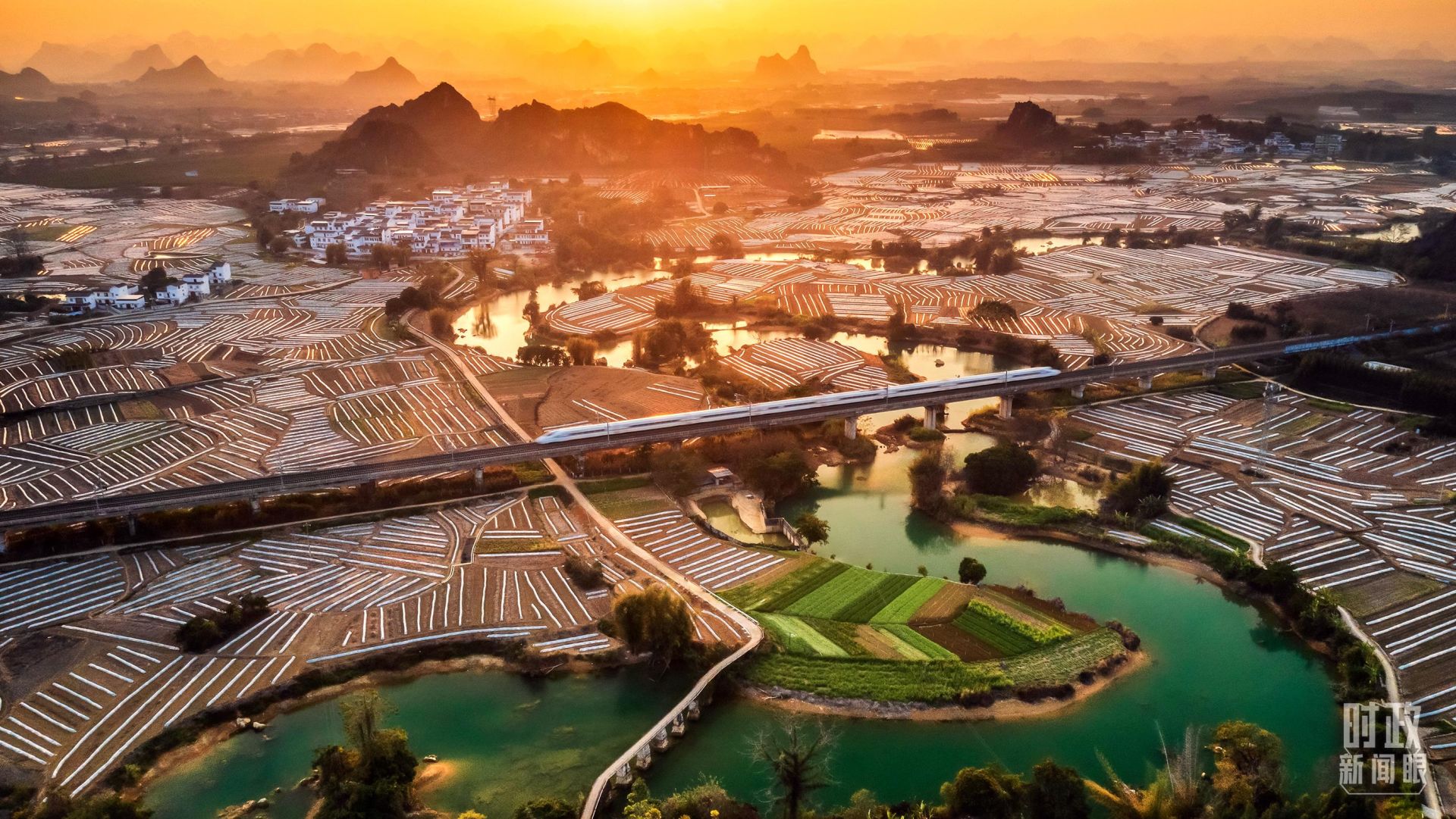 △2023年1月25日,农历春节期间,一辆高铁列车驶过南宁隆安县蔬果种植基地和新农村。(图/视觉中国)