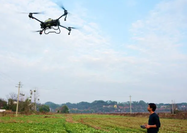 △近日,江西赣州信丰县,农户在试飞植保无人机。