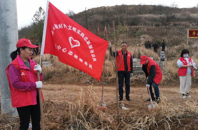 在我国第45个植树节来临之际,县公共检验检测中心新时代文明实践站志愿者们积极响应县委县政府号召,身穿红马甲,肩扛铁锹,手提水桶,积极向山头发起“总攻”,清坑、扶树、铲土、踩实、浇水每组人员密切协作,植树流程一气呵成,不一会儿一颗颗新栽树苗在蓝天下迎风招展。