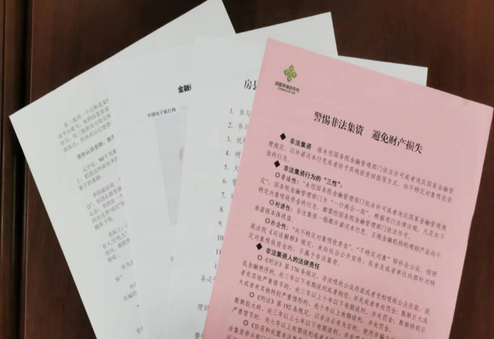 注重实效,加大重点人群防控。按照市社《关于做好2023年第一季度防范非法集资宣传周工作的通知》文件精神,紧紧围绕非法集资的社会危害性、主要表现形式和特征,广泛宣传《防范和处置非法集资条例》、信访条例、防范打击非法集资相关的法律法规等,提高群众的识别能力,避免切身利益受到损害。同时,注重深入研究分析非法集资的特点,分析受害人的特点,注意区分对象,用不同的方式进行宣传教育。针对受害人文化水平较低的特点,编制了以防范和打击非法集资活动为主要内容的宣传资料500多份,运用通俗易懂的语言,结合具体案例说“法”、讲“法”。针对非法集资有网上蔓延趋势的特点,本次组织系统退休老干部集中学习,深入单位所驻村、社属企业、包联小区入户宣传防范非法集资知识,共计发放宣传资料300余份;利用单位工作群、小区包联微信群等平台,大力宣传相关法律法规,提示广大群众,注意防范网络上的非法集资。