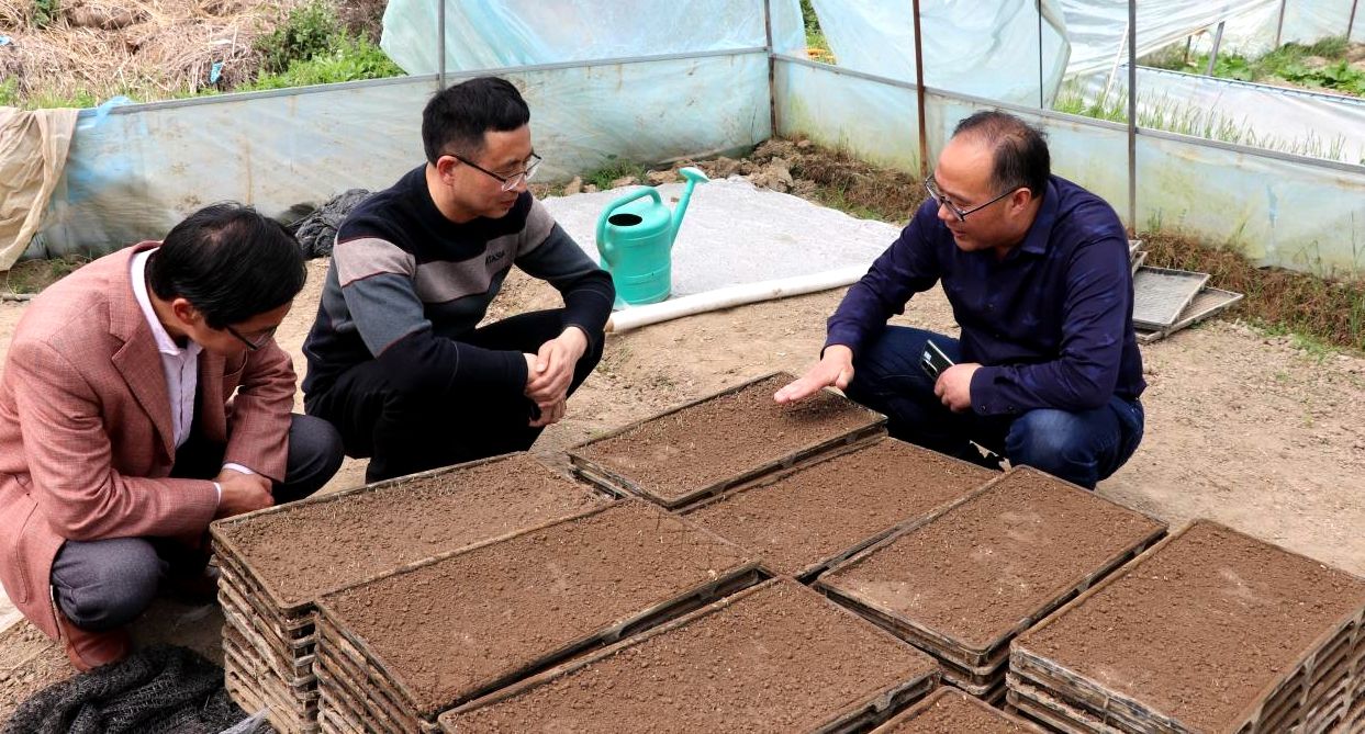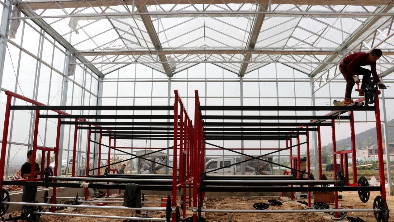 在红塔镇朱湾村胜利农机服务专业合作社,智能化育秧中心在忙碌建设中,玻璃大棚内,技术人员正在安装两台旋转式苗床。一周后,这两台苗床上将被层层摆铺上暗化催芽好的秧盘,秧苗在温度、湿度、光照严格控制的智能化育秧中心内充分成长。