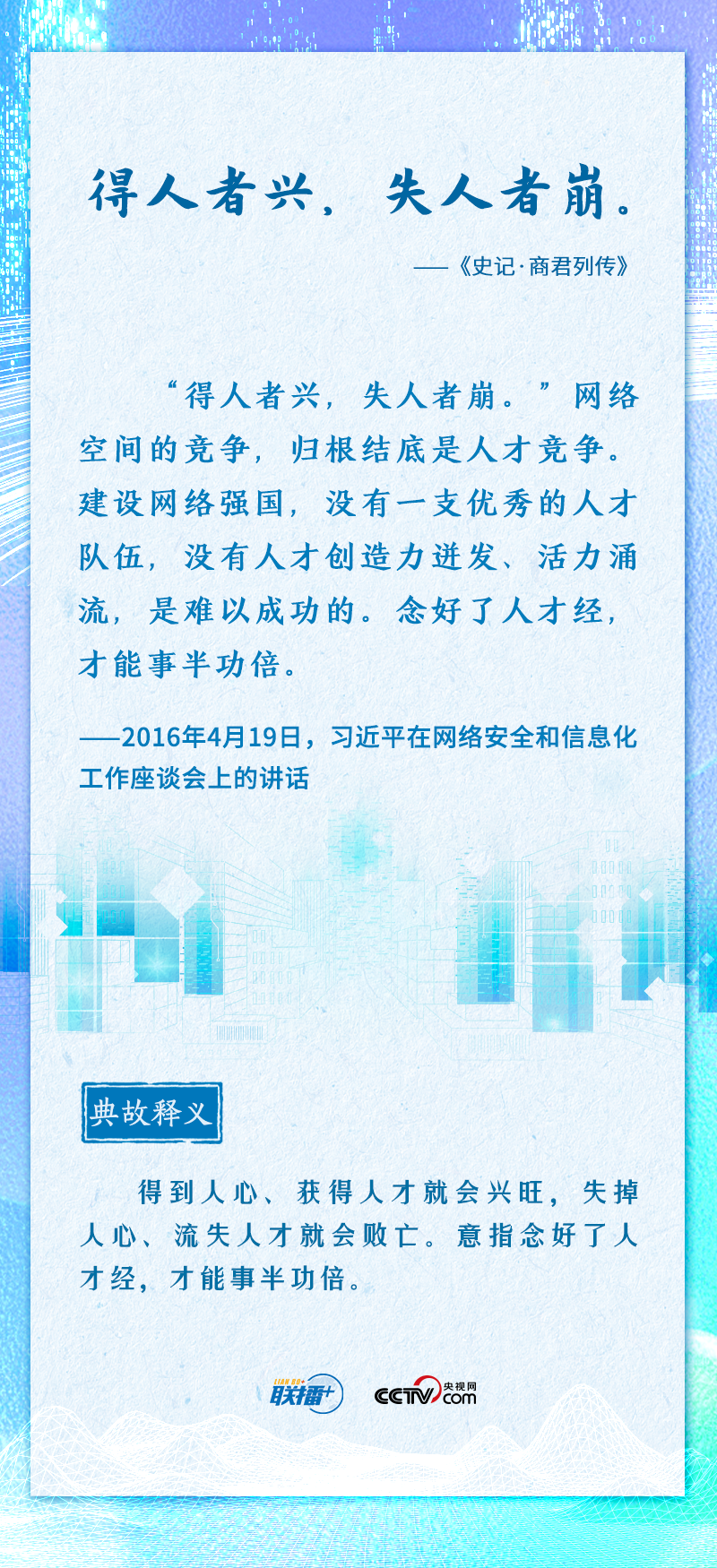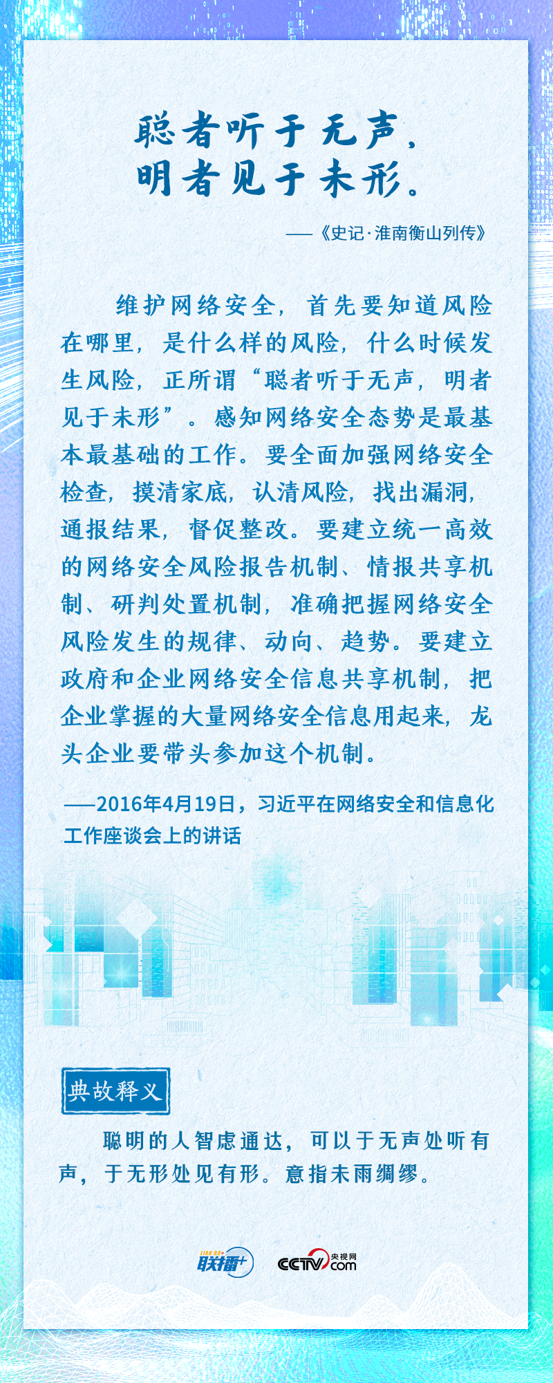 值此网络安全和信息化工作座谈会召开七周年之际,央视网《联播+》推出海报,邀您一起重温总书记的经典论述。