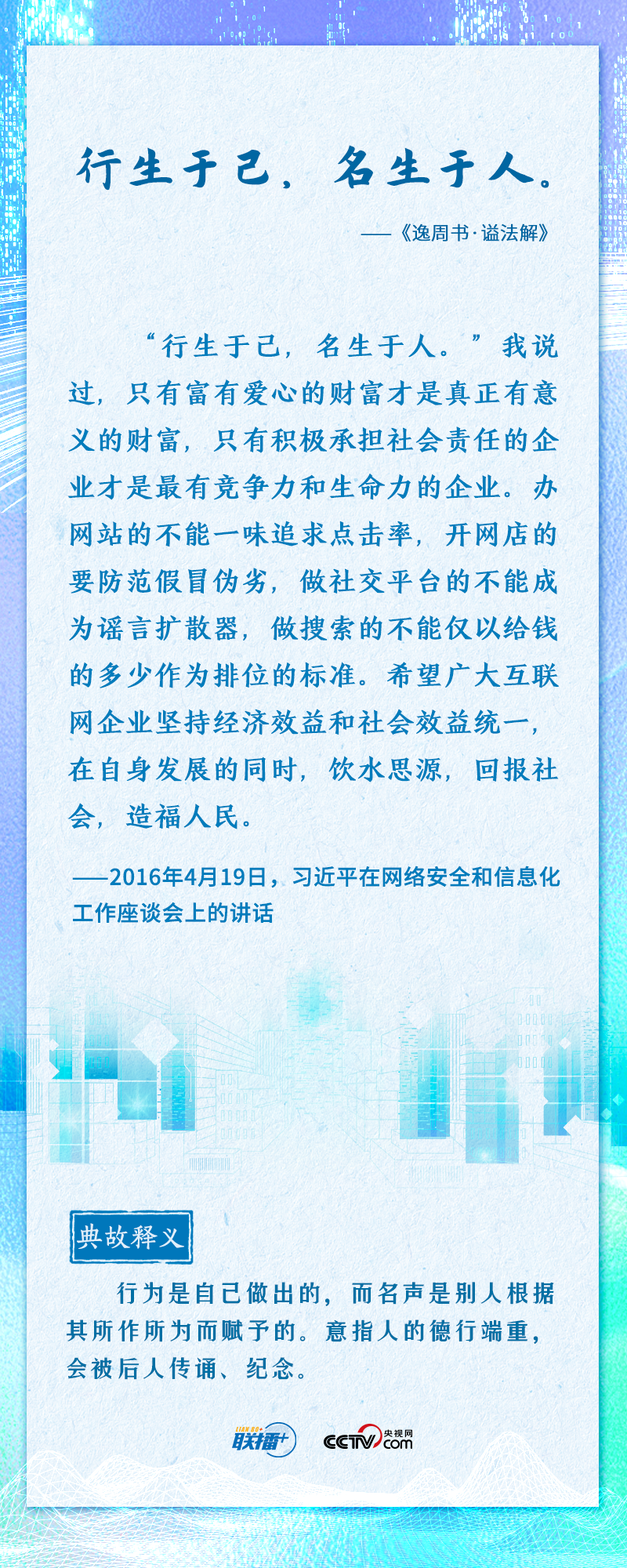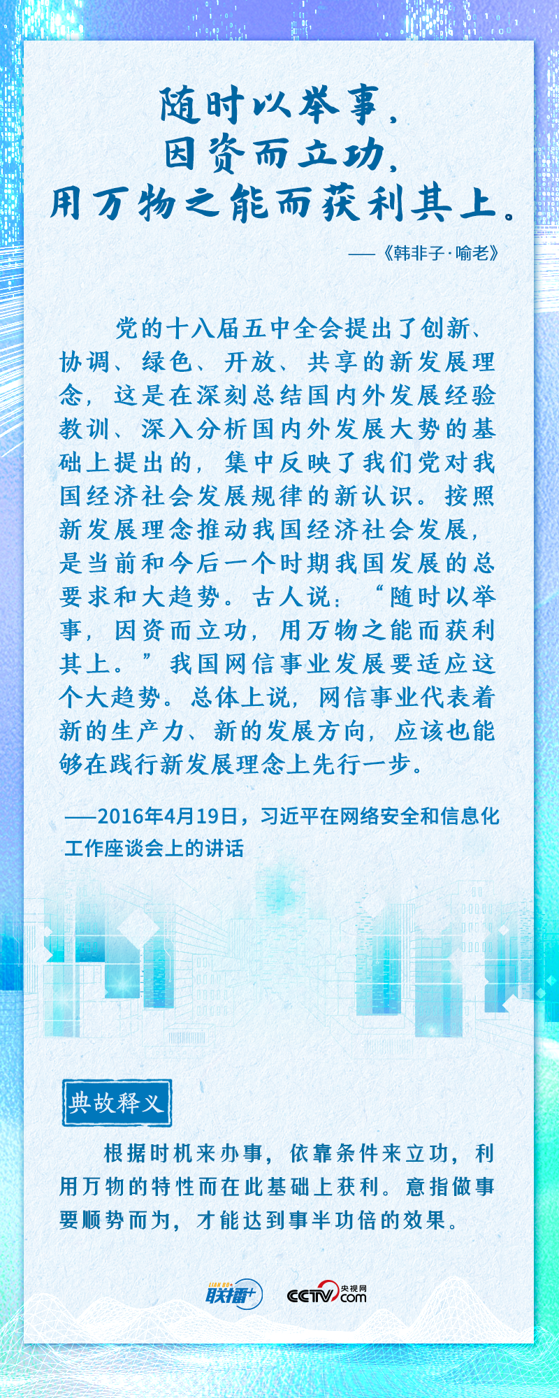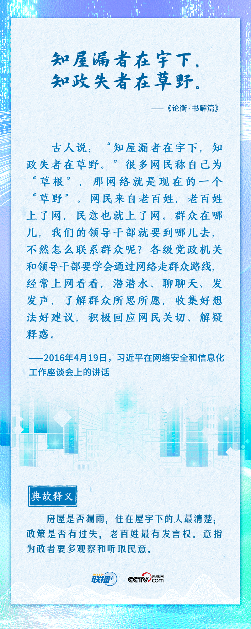 联播+“知屋漏者在宇下,知政失者在草野”“日日行,不怕千万里;常常做,不怕千万事”......2016年4月19日,习近平总书记在网络安全和信息化工作座谈会上,从六个方面深刻回答了事关我国网信事业发展的一系列重大理论和实践问题,并多次引经据典加以阐述。
