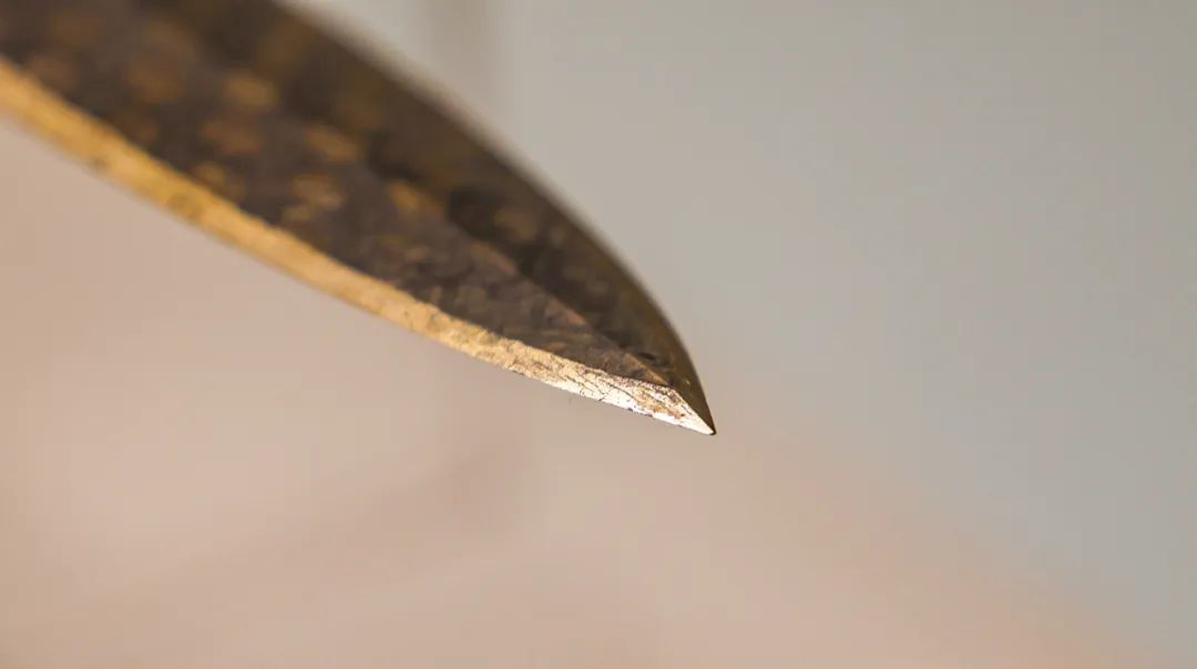 铸剑师采用最上乘的材料打造了这柄勾践剑,所用的铜料、锡料、铅料都非常讲究——质量好、杂质少、纯粹。第二招,这种流行工艺,其实“暗藏玄机”。春秋战国时期,出土的许多宝剑都有菱形暗格花纹,这种技术是当时比较流行的制剑工艺。勾践剑的剑身也遍布这种花纹,经过硫化处理,可以防止锈蚀,从而保持花纹艳丽。