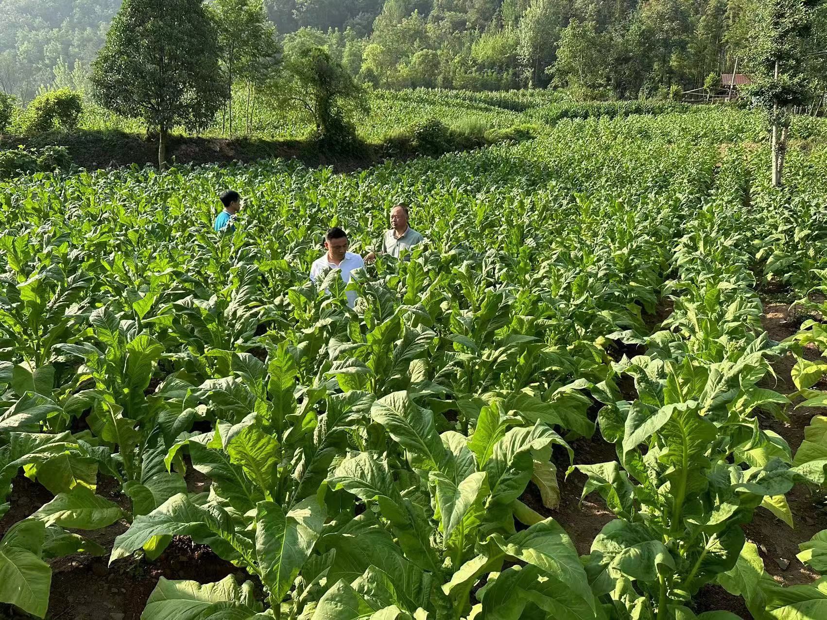 走进青峰镇龙王沟村,在烟叶种植基地里,一片片绿油油的烟叶在夏日微风中形成阵阵绿浪,宽大肥实的烟叶,根茎粗壮,长势喜人,从地头一直延伸到地尾,与远处的青山融为一体,呈现出一幅美丽的夏日丰收画卷,烟农们正穿梭在绿浪间,仔细查看烟叶生长情况,并对开花且向上生长的烟叶进行科学“打顶抑芽”。
