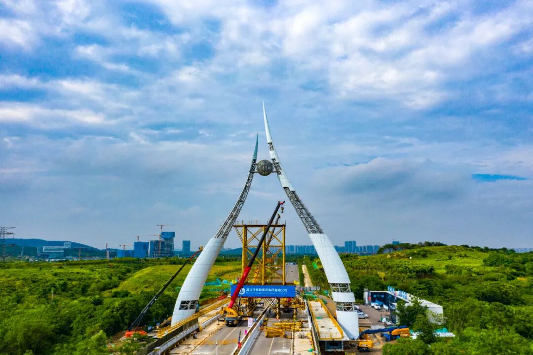 2023年6月19日,光谷未来一路,武汉新城核心区新地标“光谷之珠”主体结构已经吊装完成,施工人员正在加紧组装外立面饰板。(湖北日报全媒记者 魏铼 实习生 李铭基 摄)