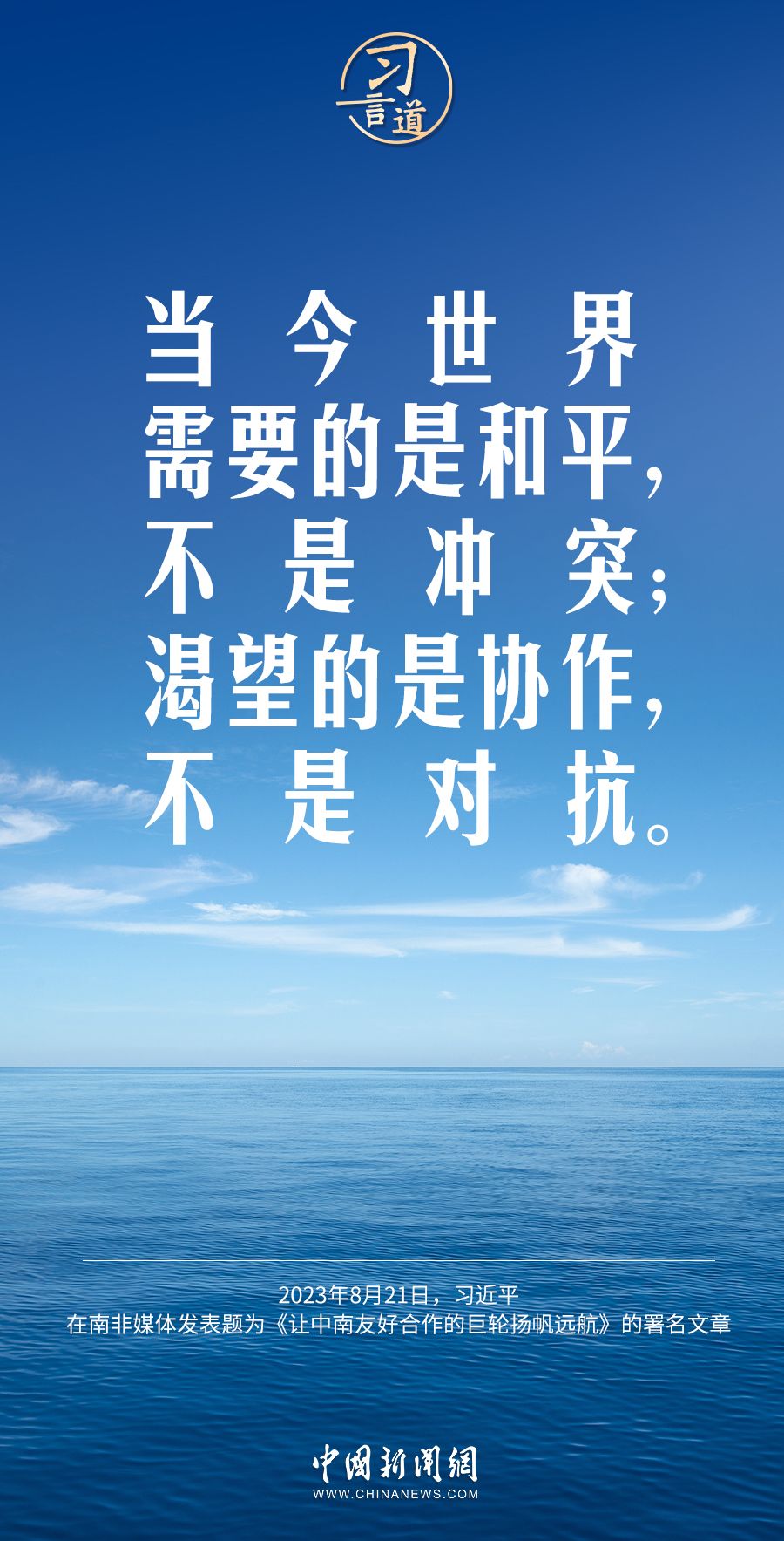 8月21日,在赴约翰内斯堡出席金砖国家领导人第十五次会晤并对南非进行国事访问之际,国家主席习近平在南非《星报》、《开普时报》、《水星报》和南非独立媒体网站发表题为《让中南友好合作的巨轮扬帆远航》的署名文章。习近平指出——