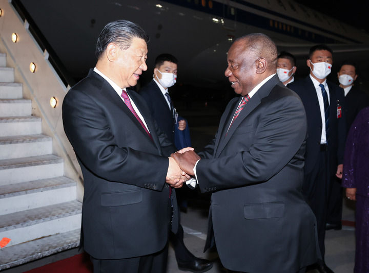 当地时间8月21日晚,国家主席习近平抵达约翰内斯堡,出席金砖国家领导人第十五次会晤并对南非进行国事访问。这是习近平在机场受到南非总统拉马福萨等热情迎接。