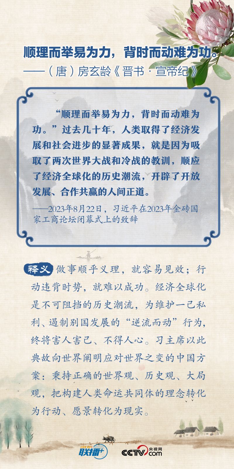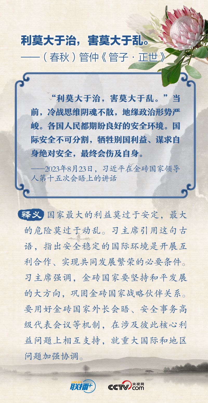 联播+“顺理而举易为力,背时而动难为功”“变化者,乃天地之自然”“利莫大于治,害莫大于乱”…… 2023年的“金砖时间”里,习近平主席多次在讲话中引经据典,阐述金砖国家的合作与发展之道。央视网《联播+》特撷取习主席用典金句,与您一起学习。
