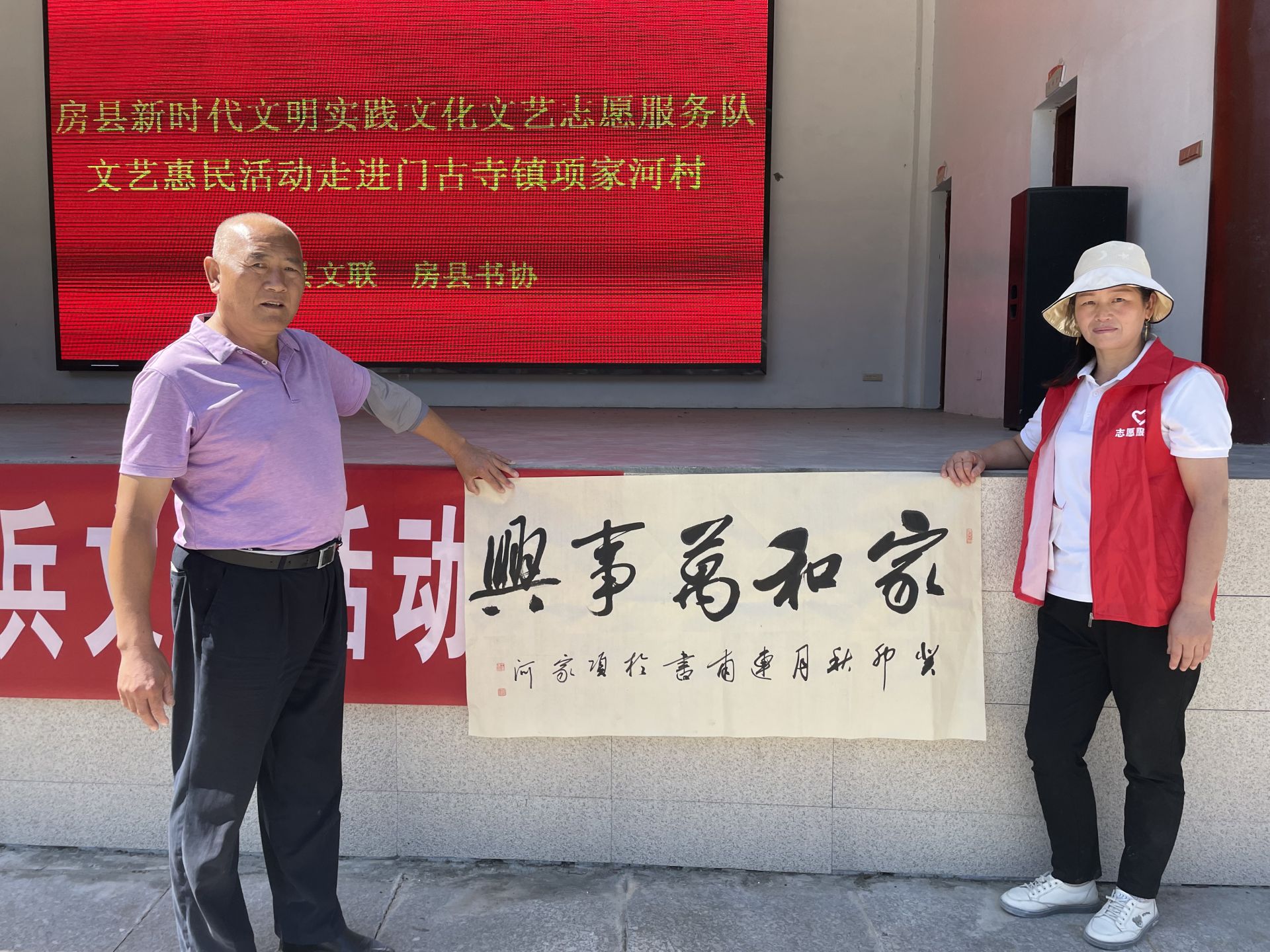 房县新闻网讯 通讯员 许诺君 高田汉 报道:8月30日,房县新时代文明实践中心文化文艺志愿服务队、红色文艺轻骑兵书法小分队走进房县门古寺镇项家河村开展“送字下乡”文艺活动,免费为居民写字,为当地群众带来了一场文字与文化的盛宴。