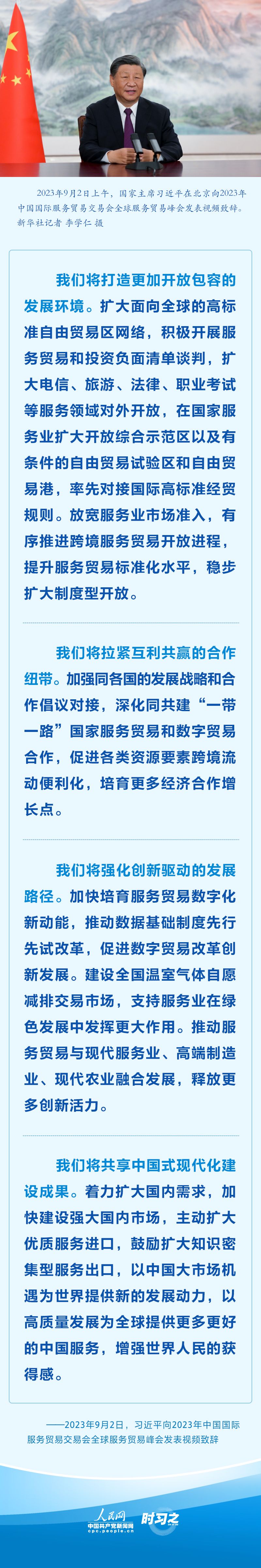 9月2日上午,国家主席习近平在北京向2023年中国国际服务贸易交易会全球服务贸易峰会发表视频致辞。习近平强调,中国愿同各国各方一道,以服务开放推动包容发展,以服务合作促进联动融通,以服务创新培育发展动能,以服务共享创造美好未来,携手推动世界经济走上持续复苏轨道。
