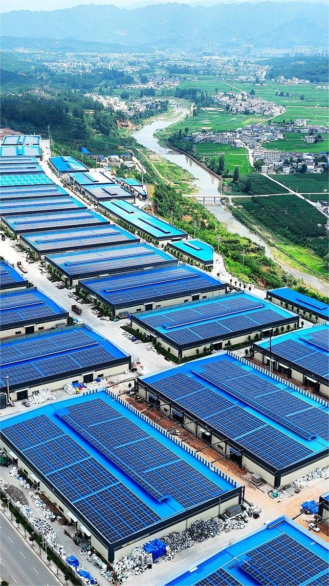 十堰市房县北城工业园连片标准化厂房屋顶已经铺设了整齐的太阳能电池板(视界网 张启龙 摄)