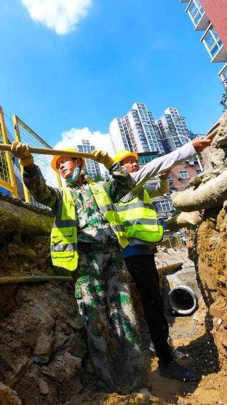 工人在十堰张湾区铺设污水管道。(湖北日报全媒记者田悦 通讯员徐春晓 摄)