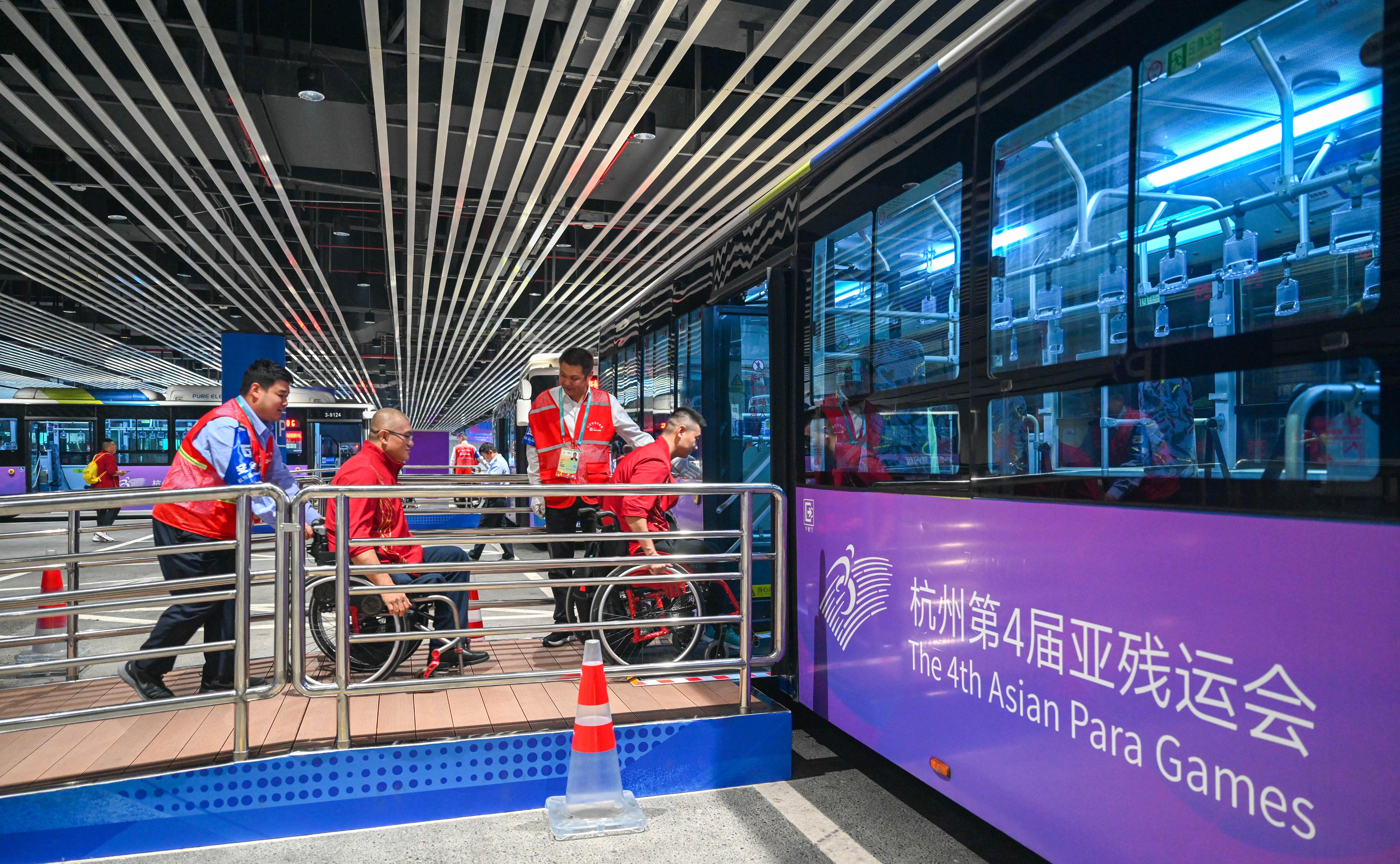 △2023年10月25日,结束轮椅篮球比赛后的中国队和阿富汗队球员通过无障碍坡道,顺利上车返回运动员村。