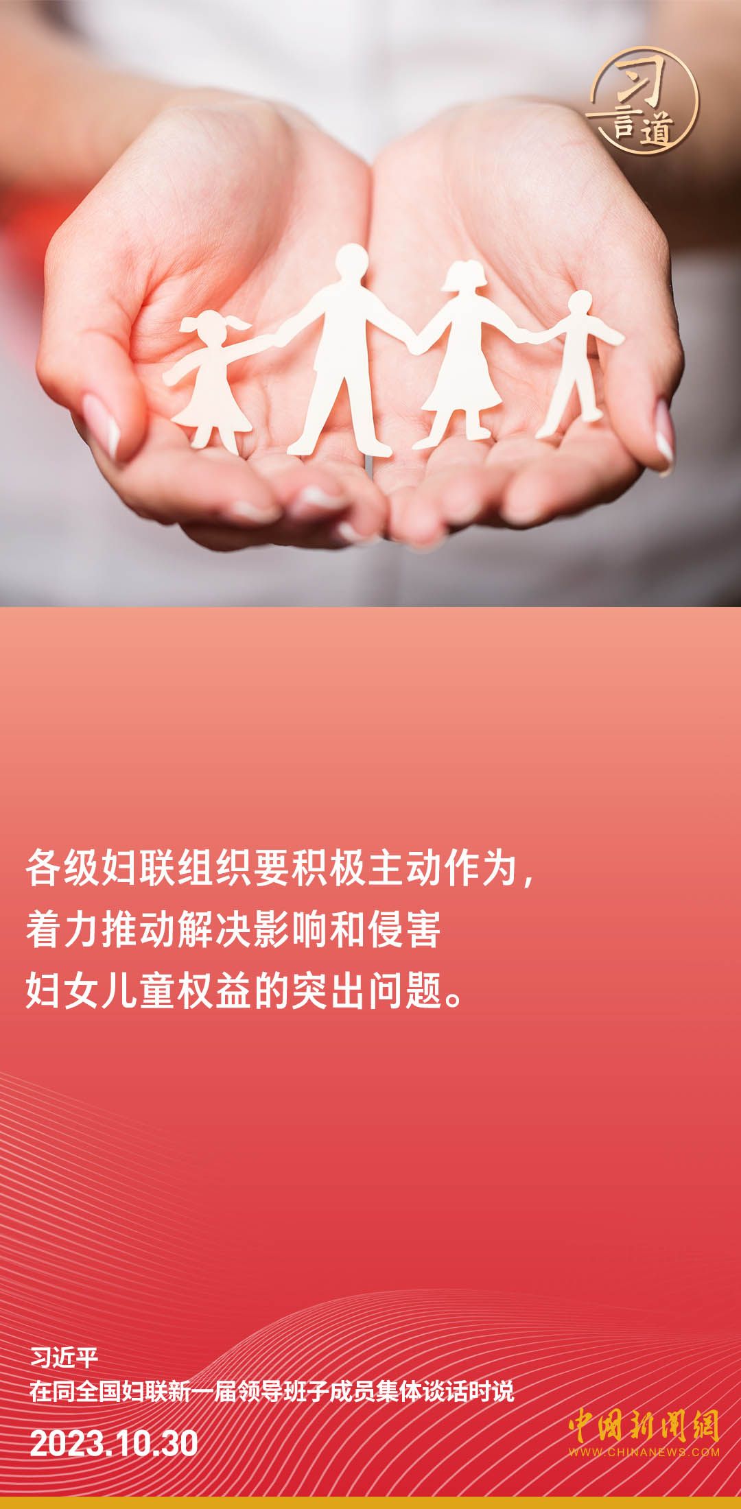 中共中央总书记、国家主席、中央军委主席习近平30日下午在中南海同全国妇联新一届领导班子成员集体谈话并发表重要讲话。习近平强调——