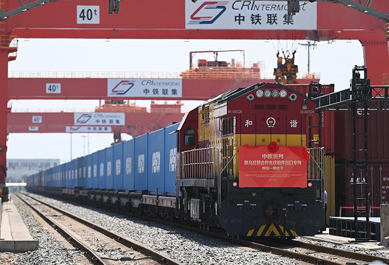 △2023年8月3日,中欧班列(西安-塔什干)陕乌经贸合作隆基绿能光伏组件出口专列在西安国际港站准备发车。