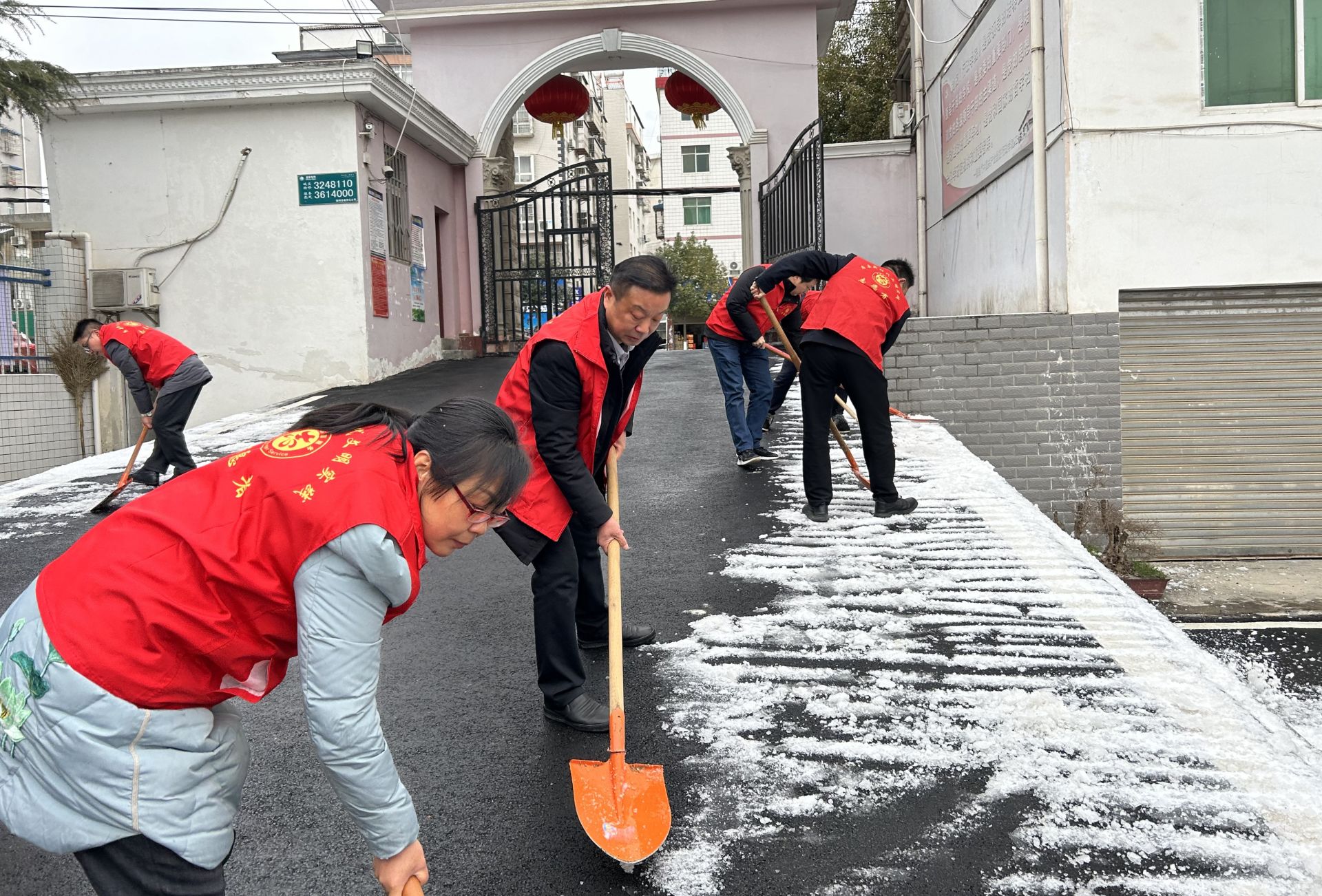 清扫现场,全体党员干部不畏严寒天气,穿上红马甲,手持铁铲等工具,互相配合、气氛融洽、动作迅速,有序对校园内外道路上的积雪和冰面进行清扫,排除道路结冰带来的安全隐患,营造安全畅通的出行环境,也赢得了周围群众的“点赞”。