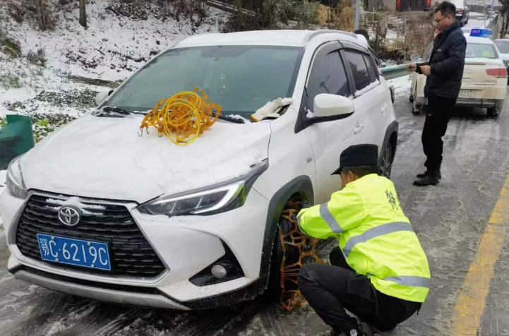 在通往集镇的必经之路上,交警四中队及派出所民警们则安排多辆警车开展巡逻,通过对事故易发、易结冰、易积雪路段设立警示牌、现场检查指导等方式,对过往车辆逢车必检,提醒过往车辆采取防滑措施并减速慢行。“叔,您这小车得装防滑链啊,不然轮子打滑很危险的。快,我们给您装上再走,不急哈!”交警四中队李警官正耐心劝说过路的司机师傅,蹲下亲自为其装上防滑链,反复确认行车有无侧滑危险,消除安全隐患。