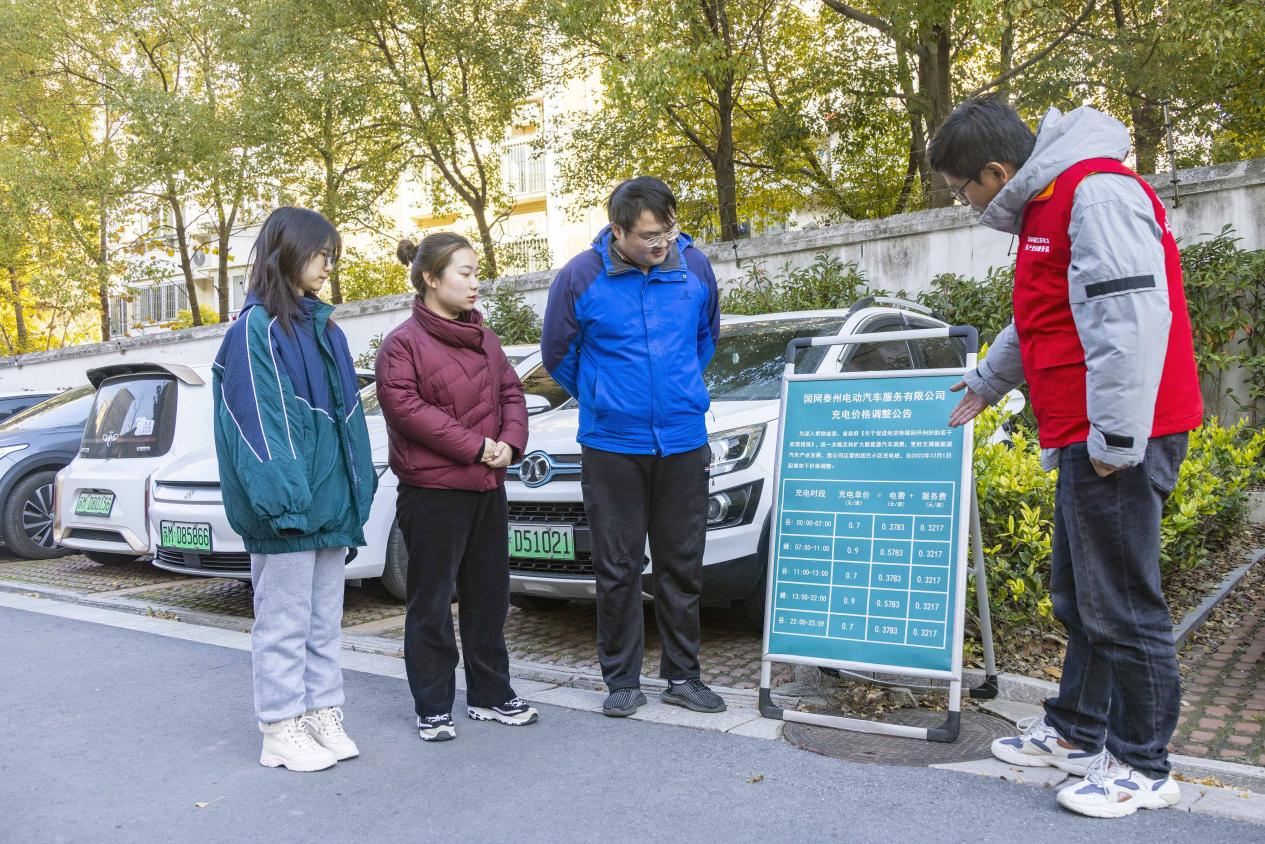 △ 2023年12月1日,工作人员在江苏省泰州市苏源花园二期居民区给车主讲解执行居民电价相关优惠政策。