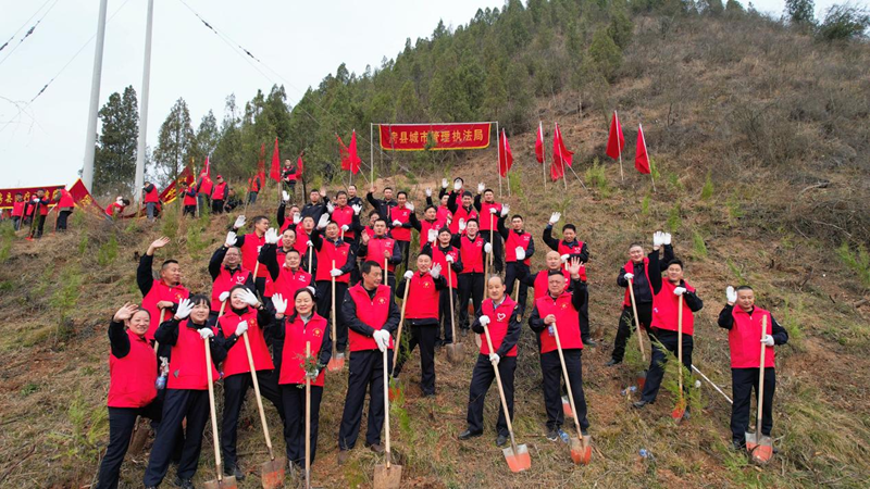 在城关镇莲花村,县城管执法局40名党员干部响应县委、政府的号召,参加一年一度的义务植树活动。
