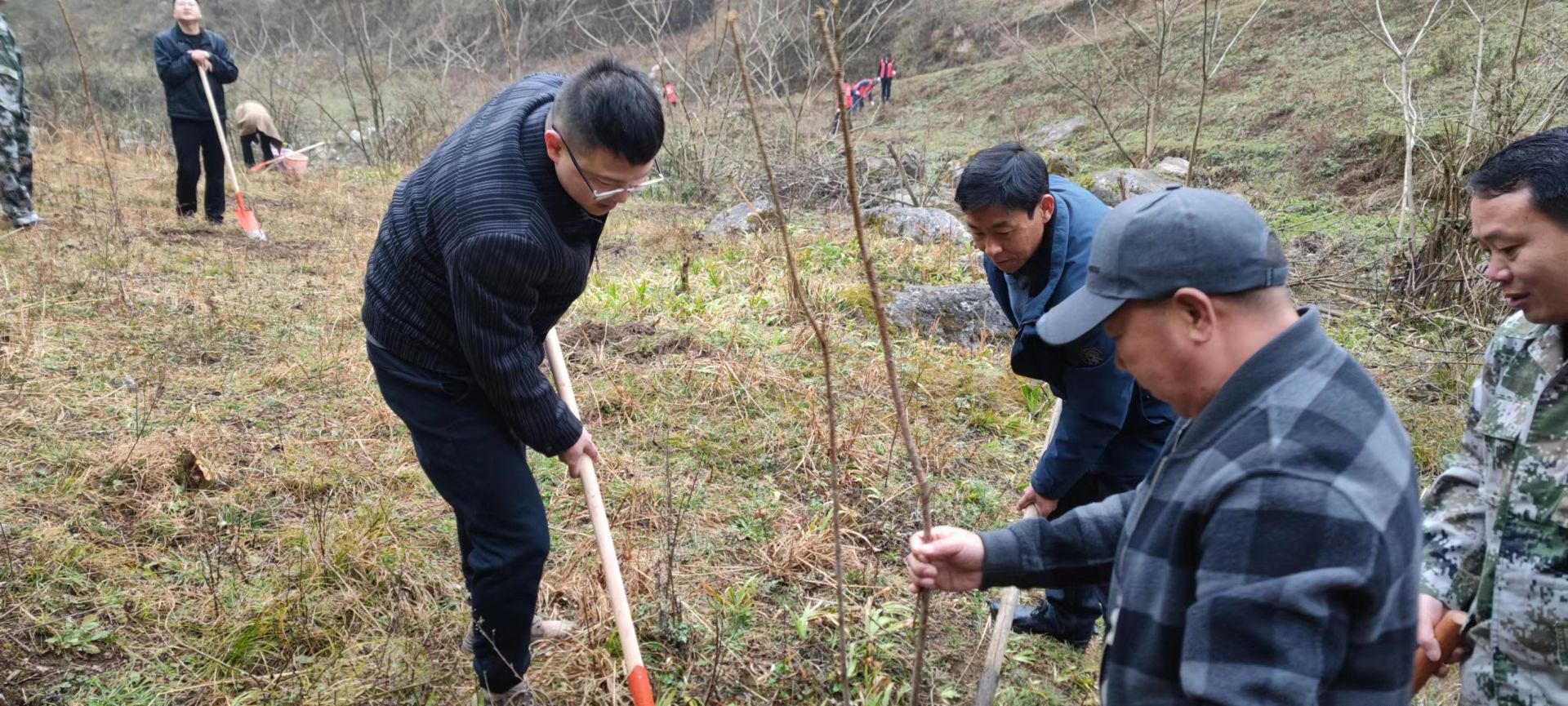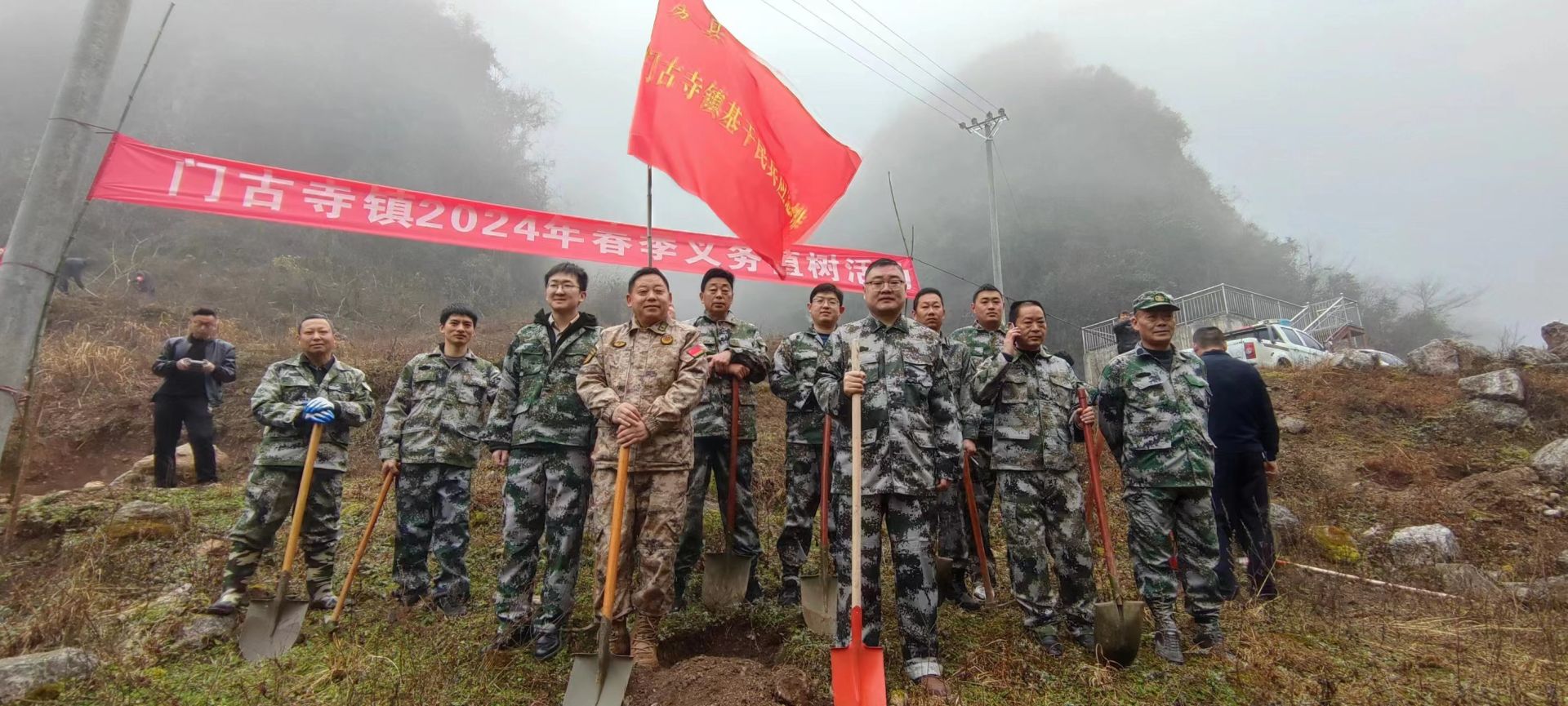 3月14日上午,门古寺镇党委、政府带领全体机关干部、镇直单位负责人、民兵、退役军人和护林员共计100余人在胡家街村贵子沟开展植树志愿服务活动。在植树现场中,大家相互配合、分工明确、干劲十足。男同志手持铁锹,散苗、栽种,女同志拿着水桶,培土、浇水,每一个步骤井然有序,林业站的工作人员进行技术指导,植树现场一派热闹繁忙的景象。