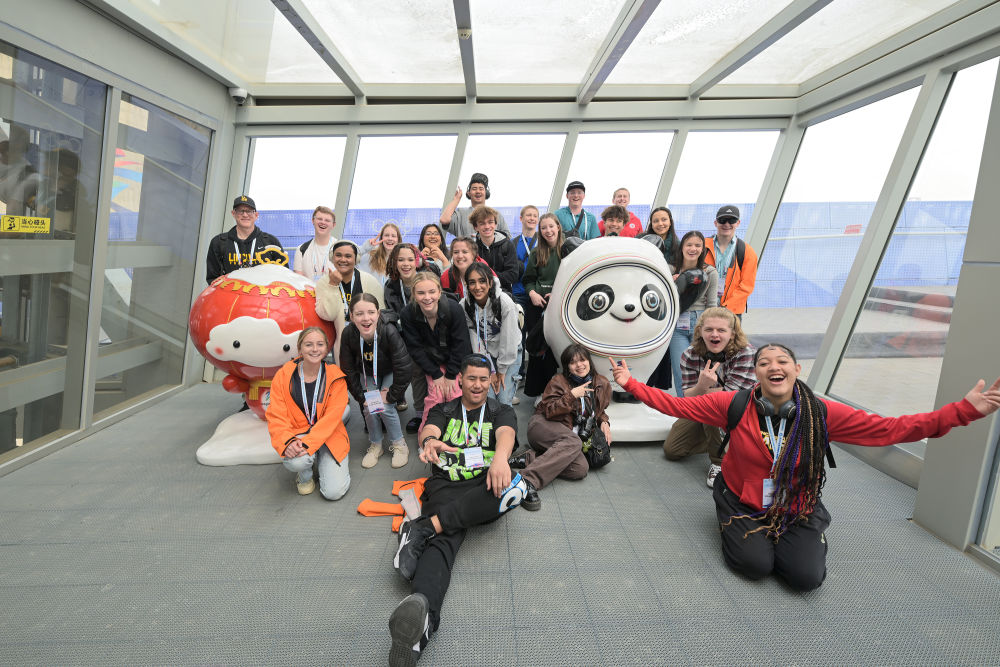3月21日,美国华盛顿州中学生代表团的成员在首钢滑雪大跳台上与冰墩墩、雪容融合影。