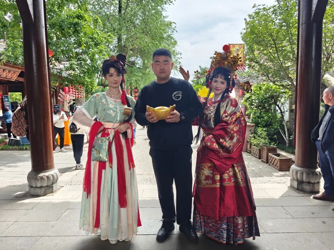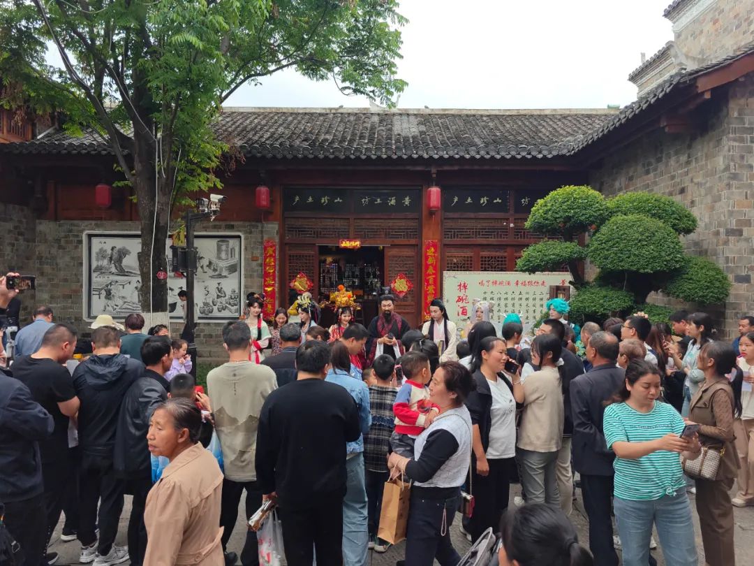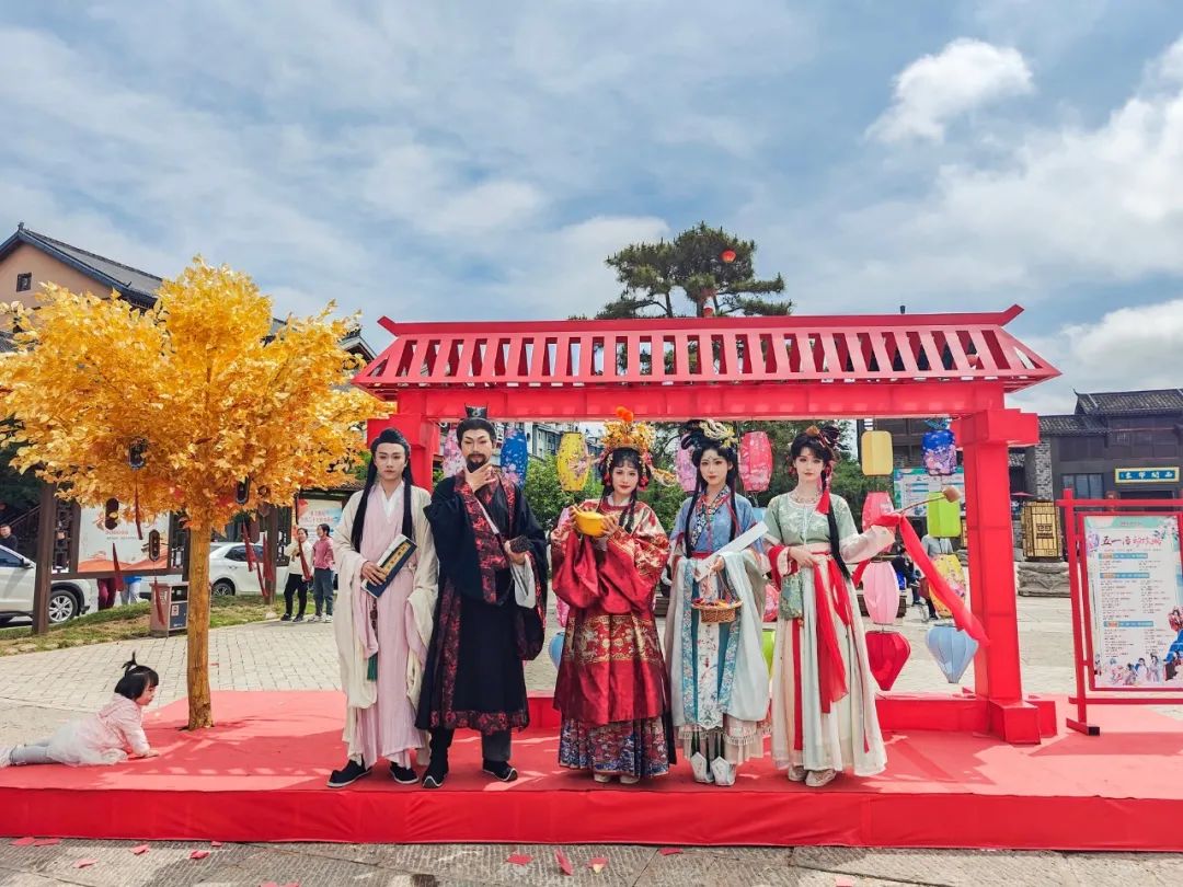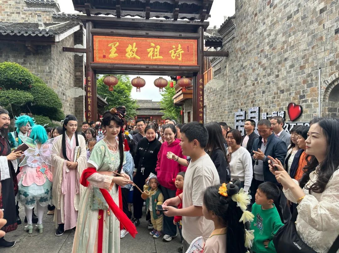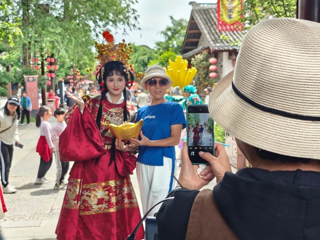 场景生动而有趣:有人正与中华诗祖尹吉甫吟诗对句,文采飞扬;有人则笑颜如花,与满面春风的女财神留下珍贵合影;黄香以其超凡脱俗的颜值,令无数过客为之倾倒。更有一幕温馨,天真烂漫的小朋友好奇询问曲娘黄酒工坊内,那醇香四溢的佳酿是否出自她一人之手,童言无忌,添了几分纯真乐趣。