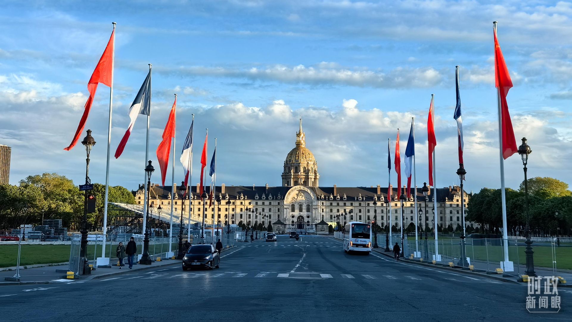 △法国巴黎荣军院前悬挂中法两国国旗。(总台国广记者吴倩拍摄)