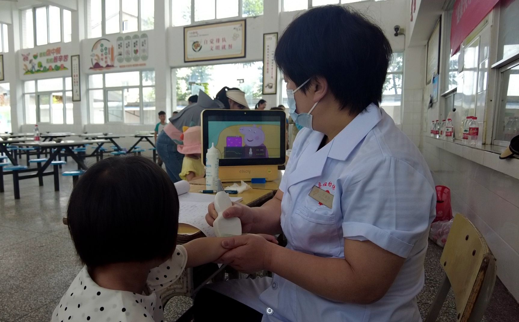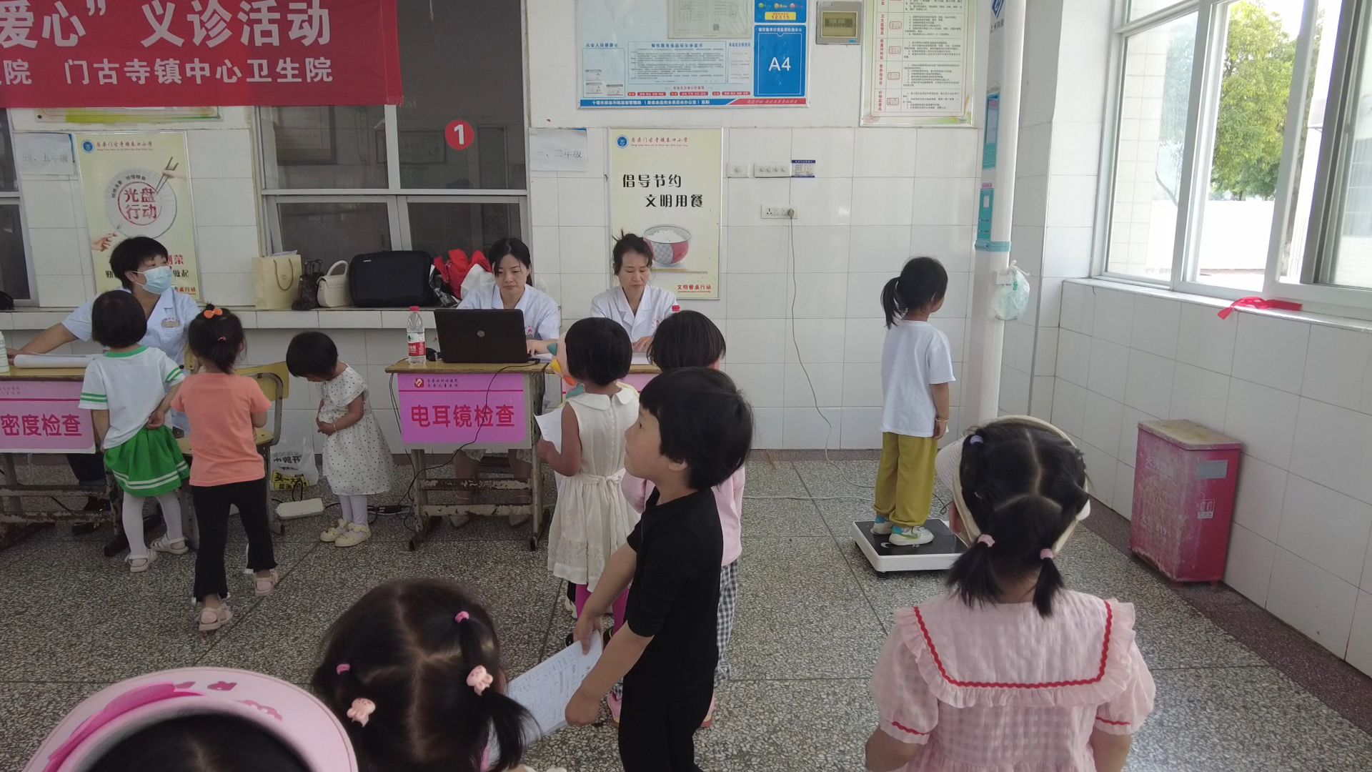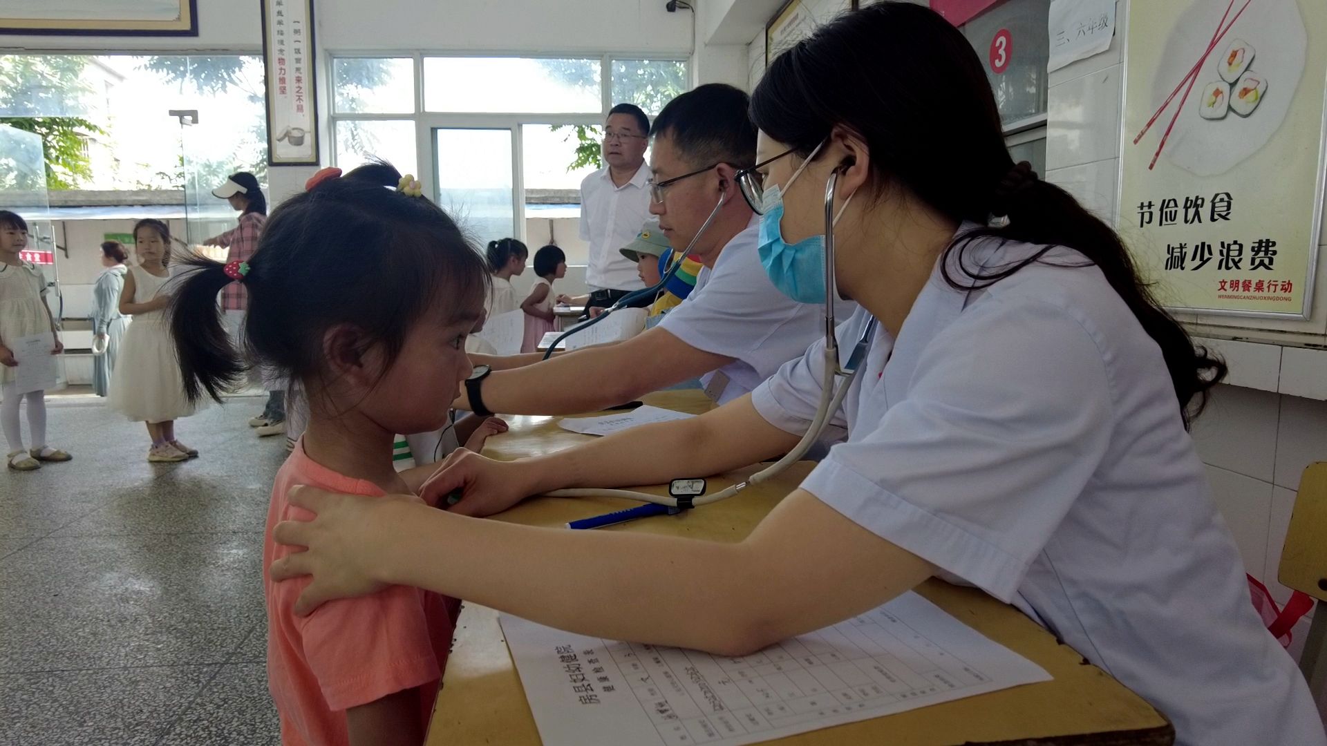 在门古寺镇秦口小学,县妇幼保健院医生面向全校三百余名学生依次进行身高、体重体格发育检测、心肺听诊、骨密度检查等健康体检。
