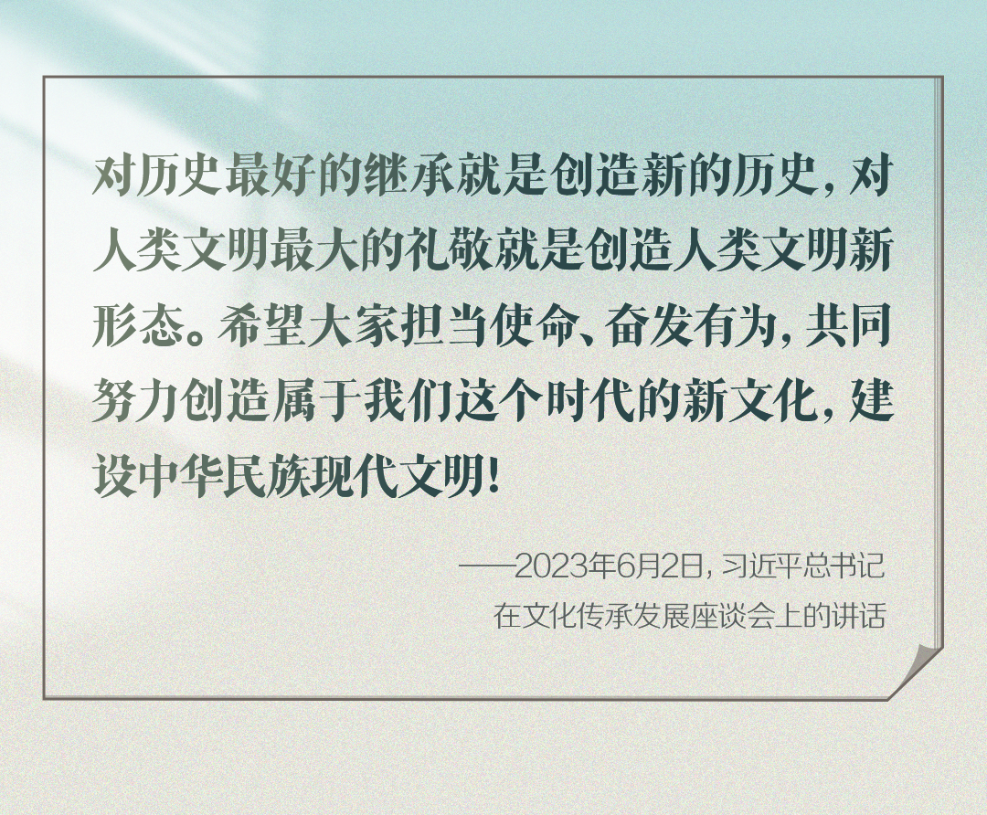 2023年6月2日,习近平总书记在文化传承发展座谈会上强调:“在新的起点上继续推动文化繁荣、建设文化强国、建设中华民族现代文明,是我们在新时代新的文化使命。”