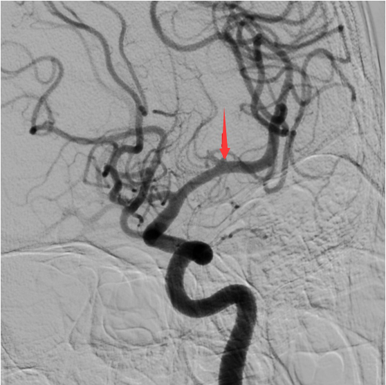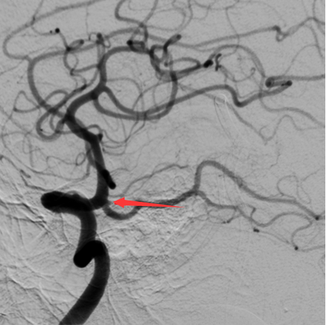 箭头所指为患者病灶处,动脉瘤大小仅1毫米,在造影上几乎微不可见。